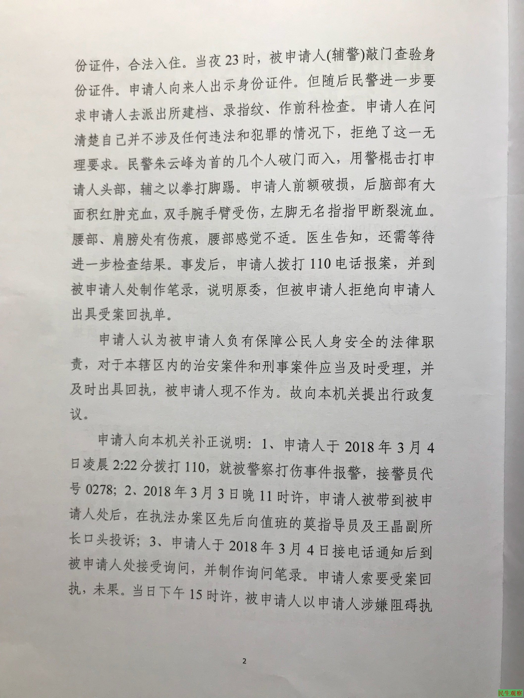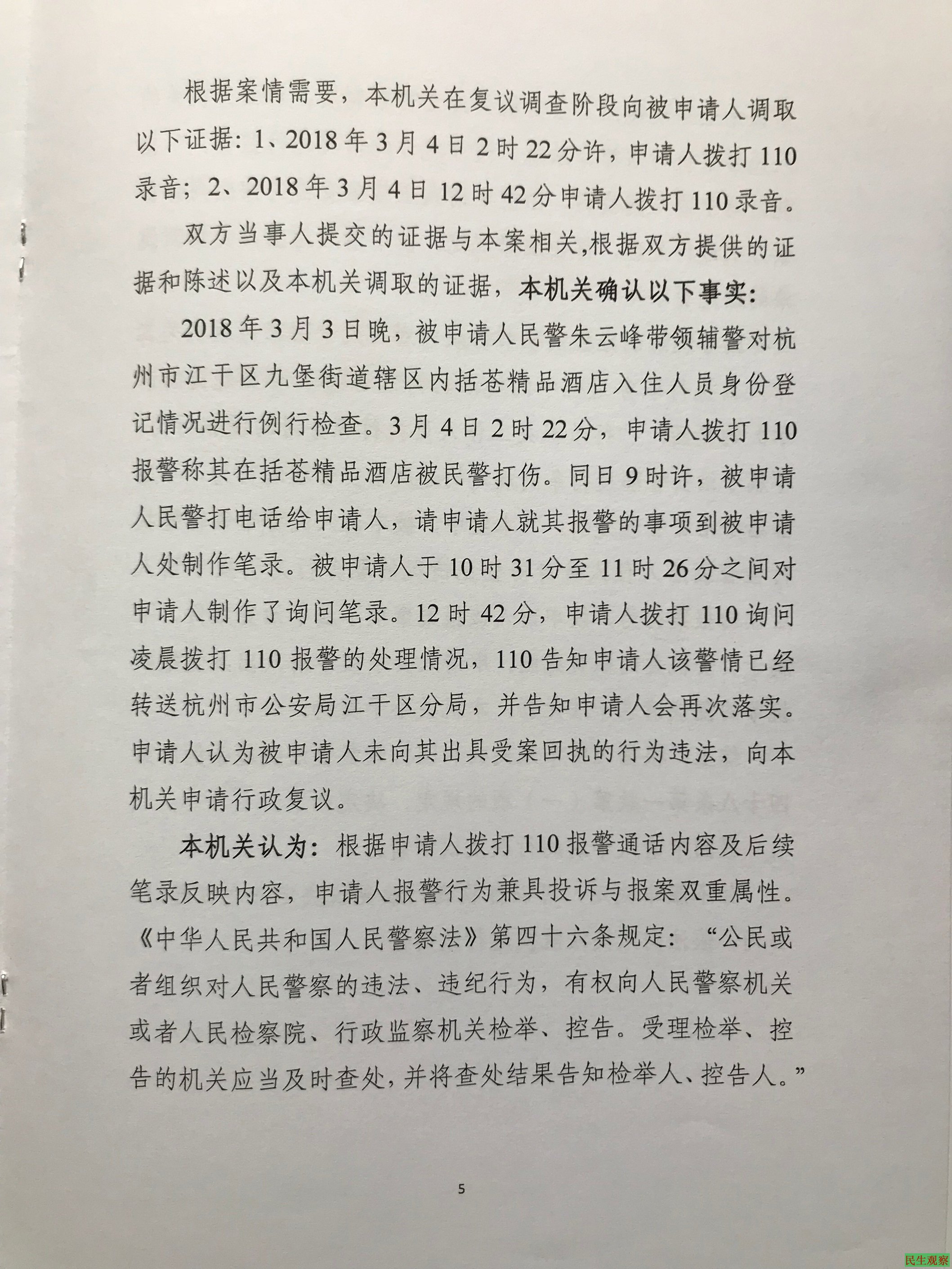 被告杭州市公安局江干区分局九堡派出所警察和辅警在原告经过酒店前台登记身份信息并经摄像头识别验证(据说准确率接近100%),且辅警敲门检查时,原告立即出示身份证,辅警明确告知原告其无违法嫌疑,仅因有前科,按照浙江省公安厅的内部规定,需要将原告带到派出所采集指纹、做笔录和提取手机数据。原告依法要求警方人员出示传唤证后,警察朱云峰等破门进入房间将原告打伤并背铐带到派出所限制原告人身自由。