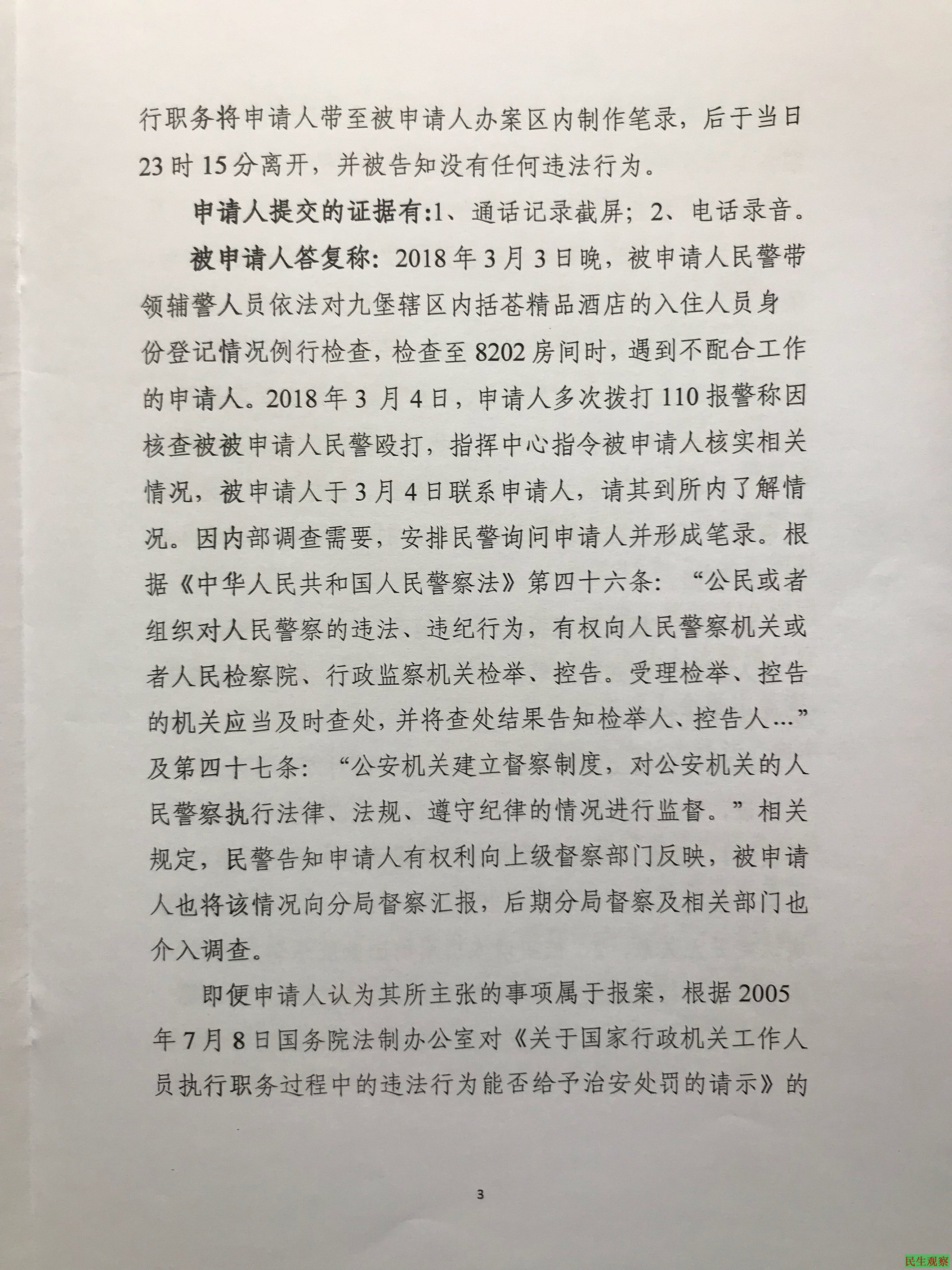 被告杭州市江干区人民政府还认为,根据国务院法制办公室秘书行政司的复函“行政机关工作人员执行职务时的侵权行为,不属于治安管理处罚条例规定的违反治安管理的行为,不应当给予治安管理处罚。”被告九堡派出所“民警带领辅警执行检查酒店入住人员身份登记情况的职务行为引发申请人后续的报案行为,故申请人报案事项不属于治安案件,不属于公安机关的职责范围。申请人要求被申请人出具受案回执单的复议请求于法无据”。