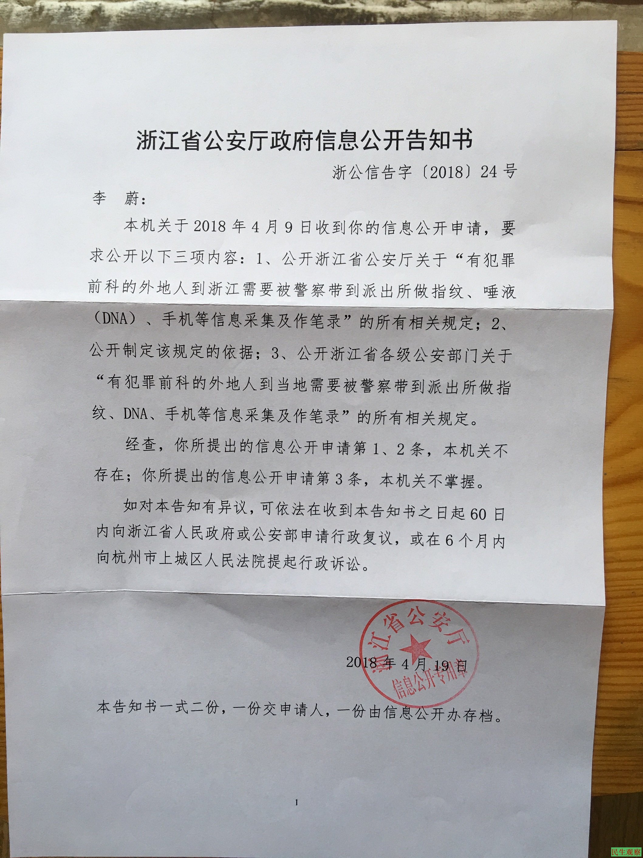 2.《浙江省公安厅政府信息公开告知书》(浙公信告字(2018)24号)复印件1张