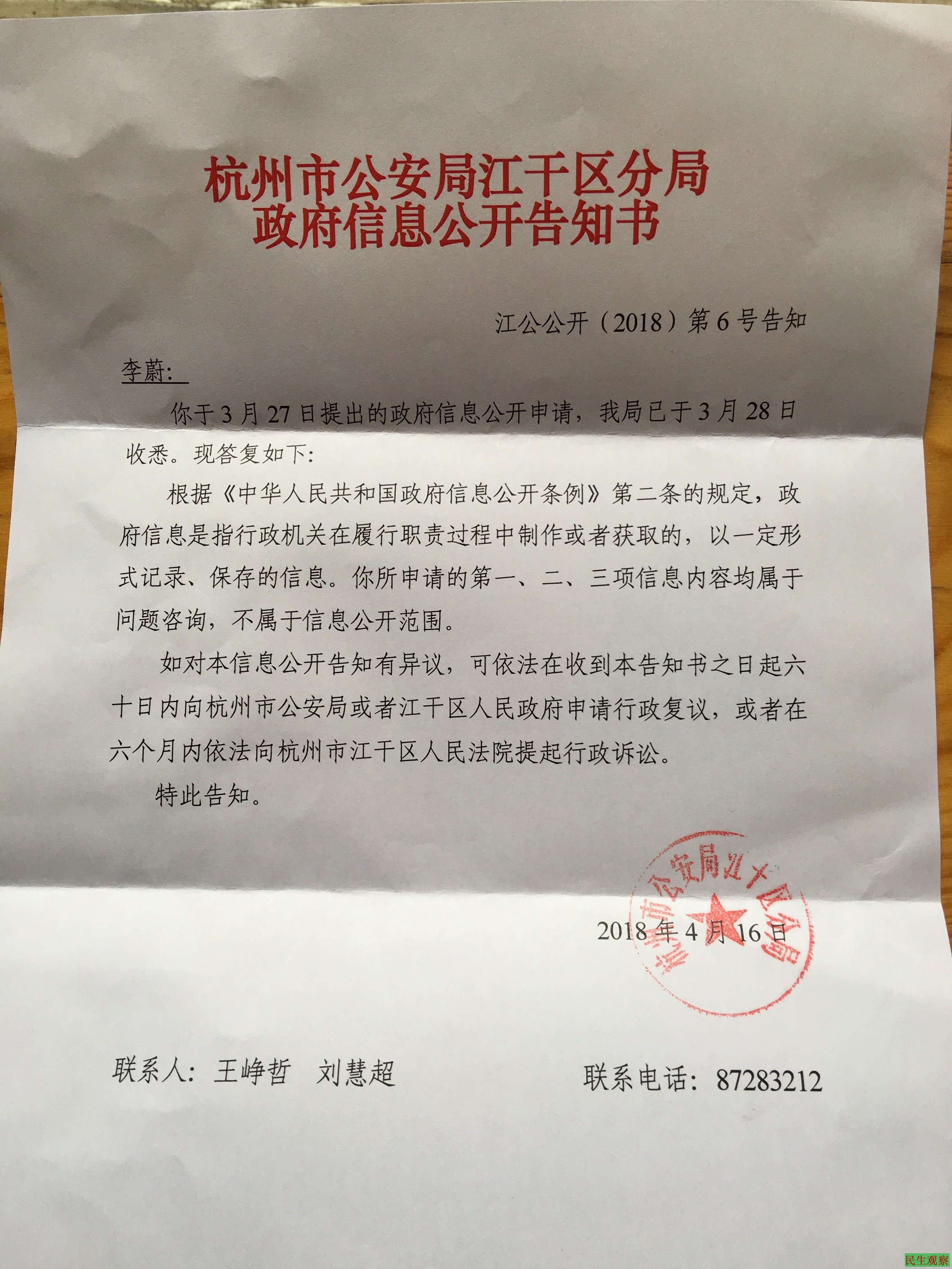 5.《杭州市公安局江干区分局政府信息公开告知书》(江公公开(2018)第7号告知)复印件1张