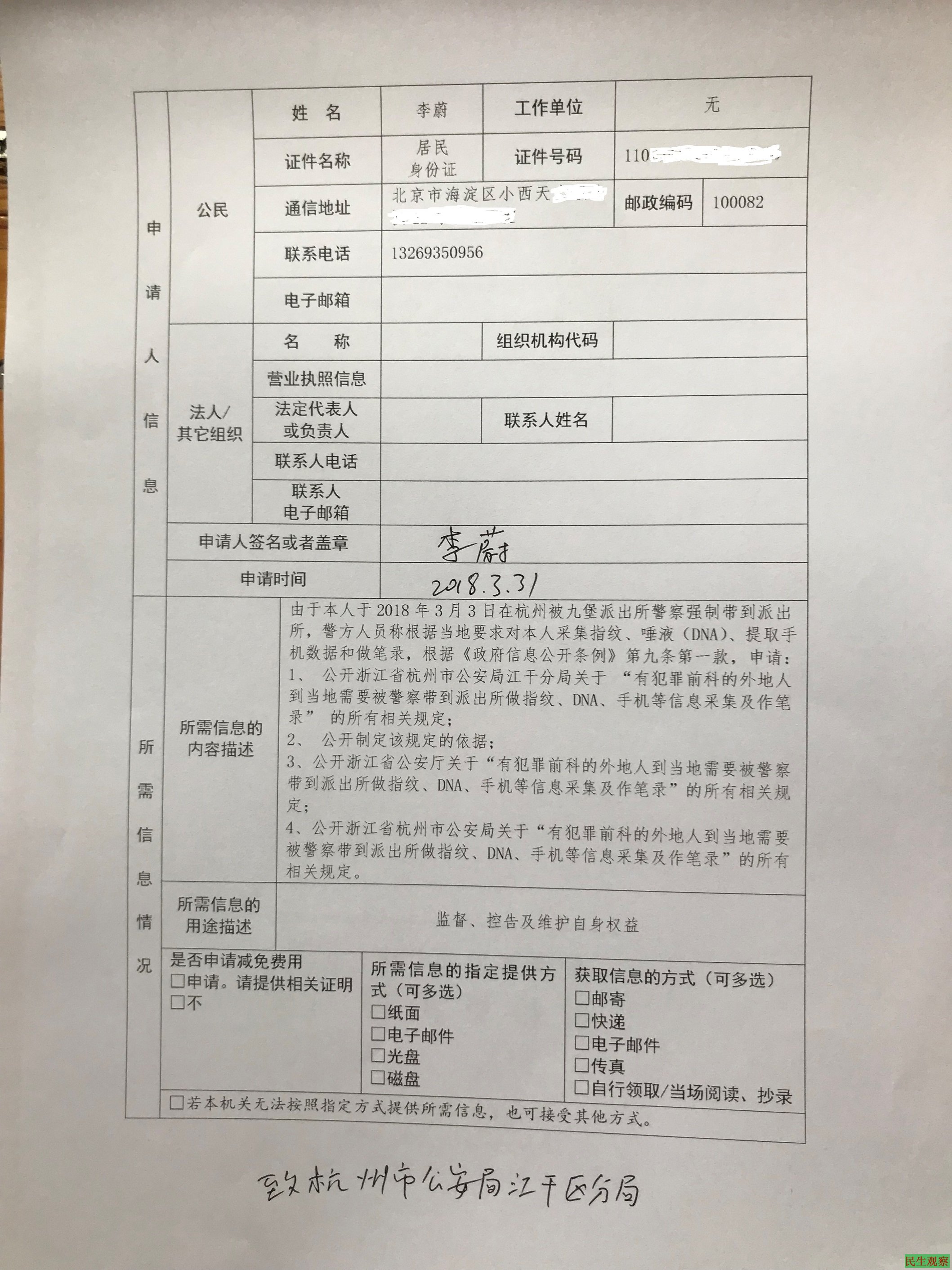 6.李蔚于2018年3月31日向浙江省杭州市公安局江干分局提出的政府信息公开申请副本1张