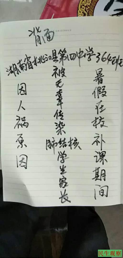 2016年7月,湖南桃江四中发现肺结核传染病疫情,在该校文科精英班364班中,至少二名高一学生被确诊为传染性肺结核。