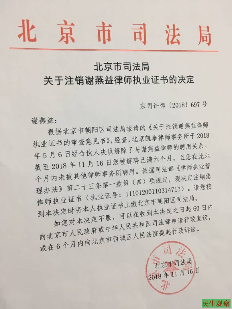 因谢燕益律师证被注销采取行动(一) |