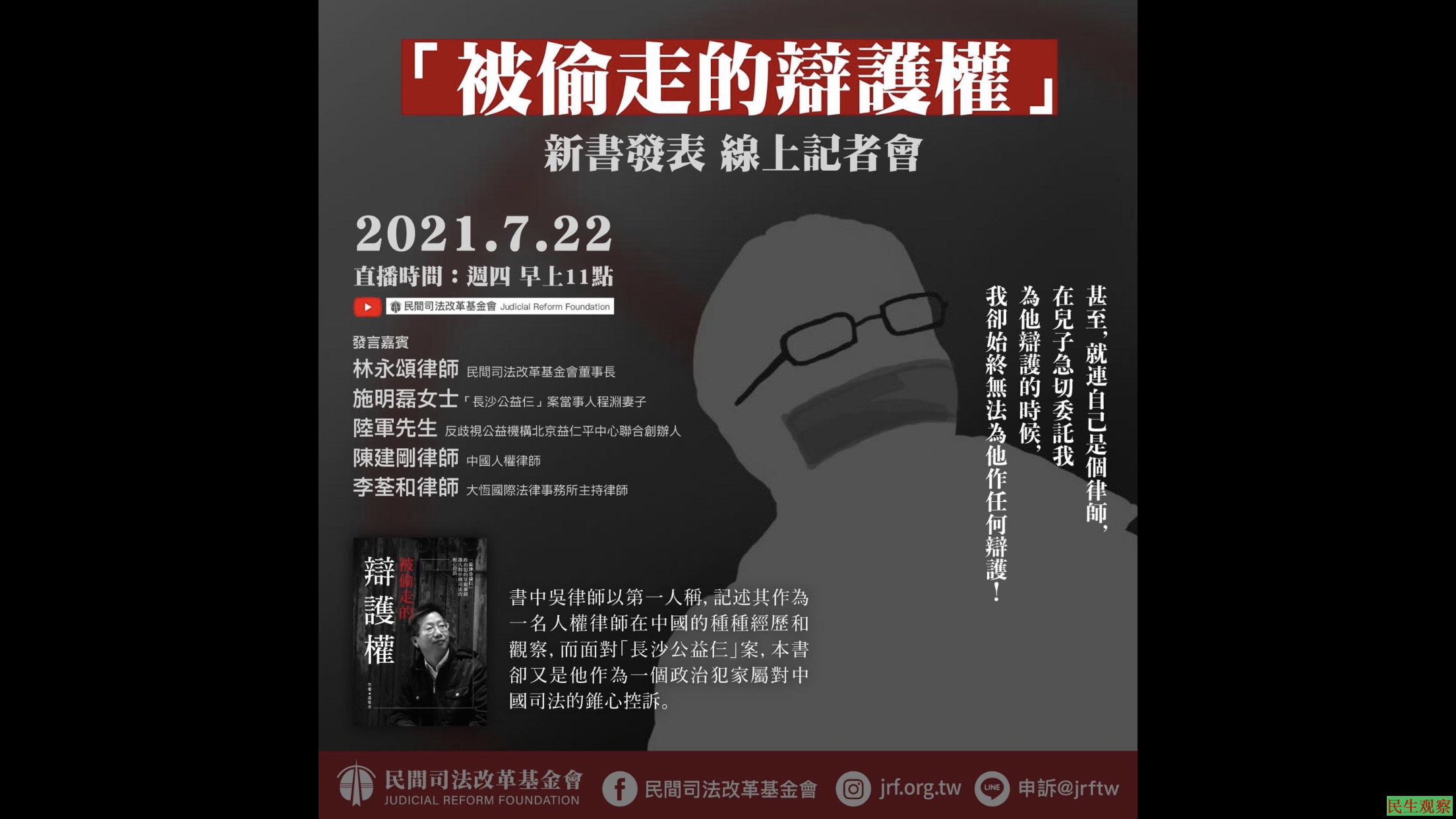 《被偷走的辩护权》一书由书中描述的中国“长沙公益仨”案当事人家属,同时也曾担任此案辩护律师的吴有水先生著作,并委请渠成文化于(22)日出版,刚好也是案发两周年,民间司法改革基金会与华人民主书院联合举办网上发布会,除了推介本书及作者亲自发表外,也邀请到案件中另外一位当事人的家属和前同事,阐述有关案件的背景及近日最新发展,直指三人已被秘密判刑。