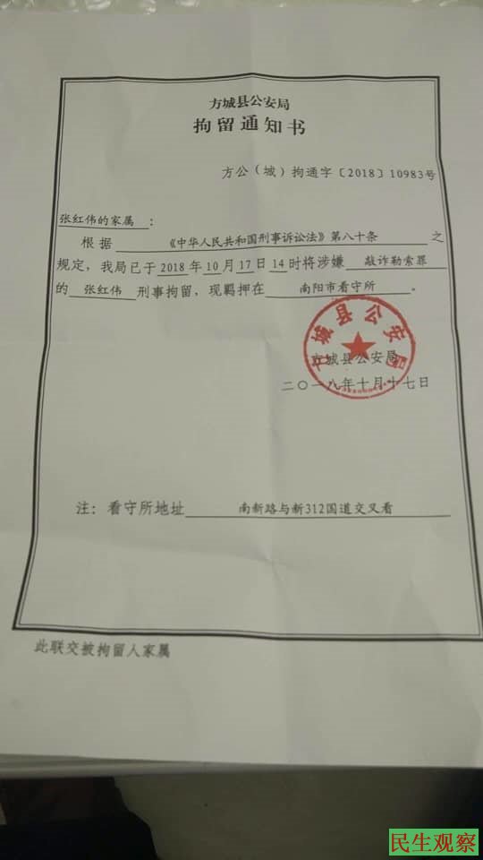 拦截董事长车的断友们被北京西城分局行政拘留五日,拘留期满后几位断友相继被释放,唯独河南张红伟被当地政府与银行单位接回去,在2018年10月17日再次被以涉嫌敲诈勒索罪刑事拘留关押在河南南阳看守所,在11月2号家属收到张红伟被逮埔的通知书,构陷罪名由涉嫌敲诈勒索罪改为强迫交易罪。