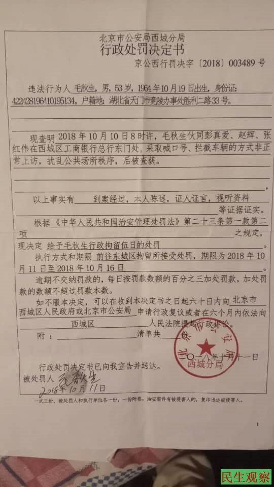 【民生观察2018年11月4日消息】河南买断下岗维权访民张红伟于2018年10月10日早上班时间7点半左右,在北京西长街中国工行银行总部西大门口董事长易会满的车被维权断友拦截,其中四人被行政拘留五日,他们是来自全国各地的维权断友,他们是内蒙的南行芝,辽宁沈阳的军嫂赵辉,湖南彭真爱,湖北毛秋生(又名毛军远),河南张红伟等断友。