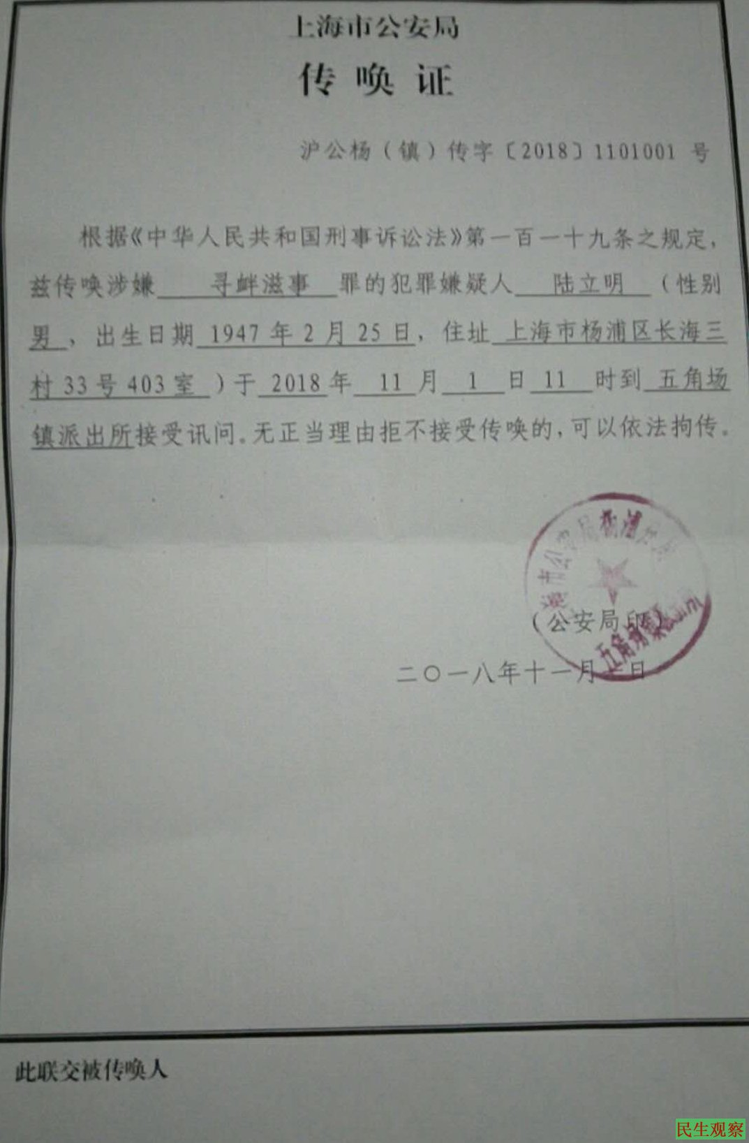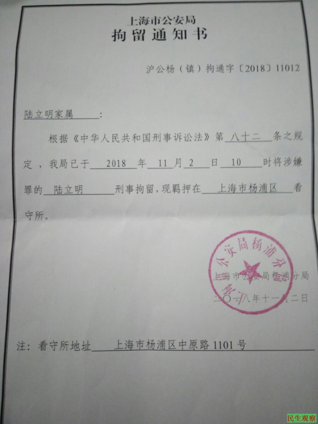 【民生观察2018年11月4日消息】本网获悉,2018年10月30日上海维权访民陆立明在京被警察以查验身份证为由扣押,随后被遣返回泸,11月1日陆立明被上海警方以涉嫌“寻衅滋事罪”传唤,第二天即被以同样罪名刑拘。