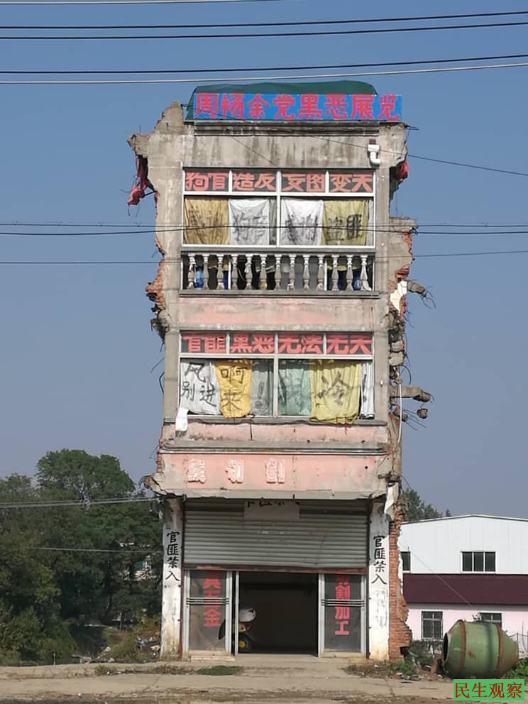 11月5日一大早,王建芬在自家残楼的楼顶上安装了金属标牌,上书“周杨余党黑恶展览”。