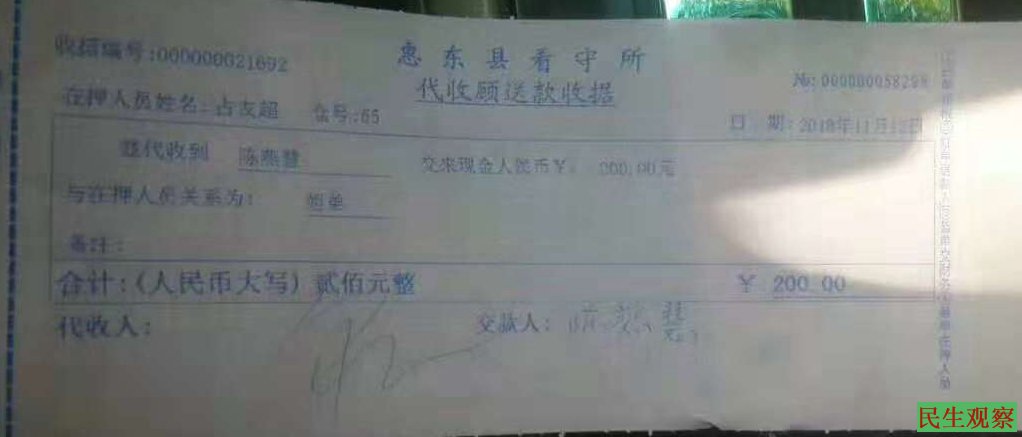 对此,湖南株洲公民陈燕慧(网名:迷迭香),希望湖南衡阳和惠东的同仁们给予关注,并于2018年11月12日前往惠东县看守所,为占友超存入了生活费。