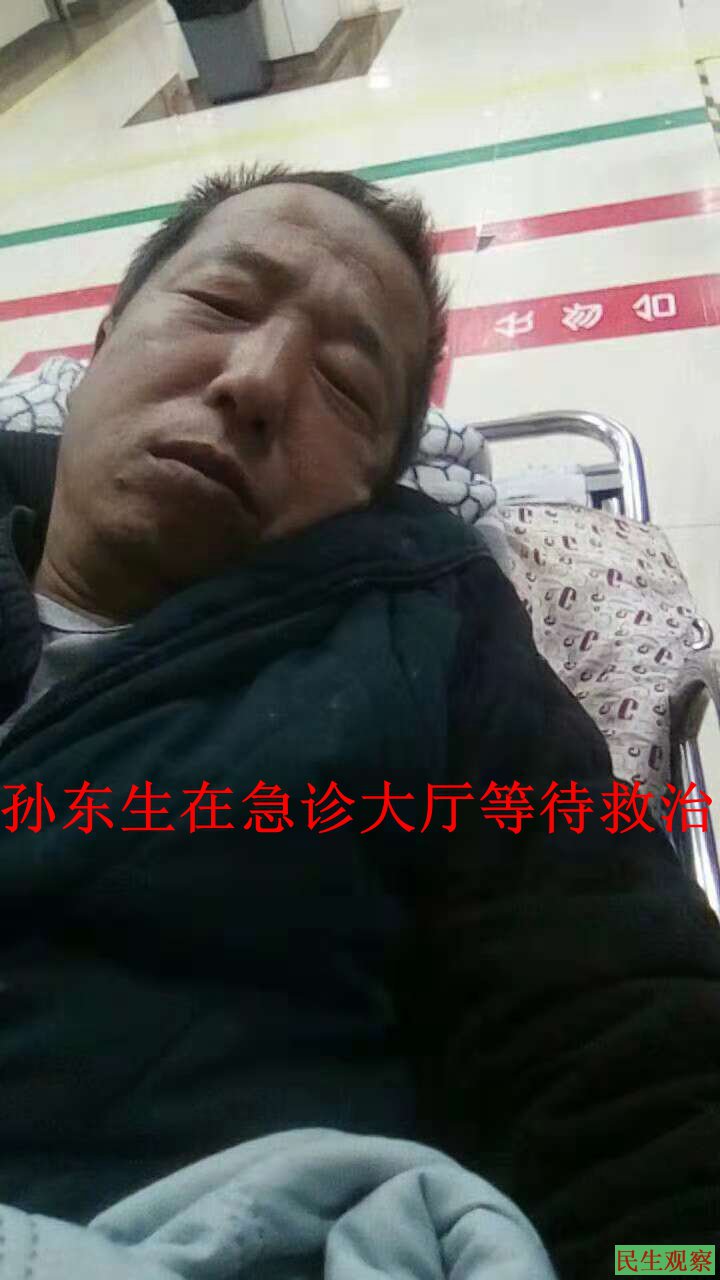 孙东生说,10月30日晚他在哈尔滨松北区张铁华大姐家门前遇到抢地逼迁土匪,用大翻斗车将土石卸在张铁华家门口封门堵路,他随即上前告诉司机,这家六口人两个学生,四个大人三个残疾,你们这么做太没人性了,这个司机听后上车开车先倒了土石下车,然后开车将他撞倒,又倒了下车将车停下,离他倒地处大约5米远。之后附近人报警,110、122都到了现场,民警交警来到现场后一商量由交警处理,这时救护车也到了,交警让司机给他看病去,司机跟救护车到了哈尔滨第一医院急诊大厅,到医院后司机却一分钱不出,偷着溜走了,而他身无分文只好躺在医院急诊大厅等待救治,后在众多维权朋友帮助下才得以入院治疗。