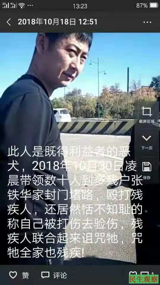 【民生观察2018年11月16日消息】近期,黑龙江哈尔滨市松北区残疾人张铁华一家遭遇当地拆迁部门封门堵路式逼迁,在得知此情况后,当地众多维权访民和残疾人士纷纷前往其家中声援。2018年10月30日晚8点左右,当逼迁人员再次到张铁华家倾倒土石时,当时在现场的哈尔滨访民孙东生随即指责逼迁人员行为卑鄙,随后被倒土车辆故意撞伤且不给医治。