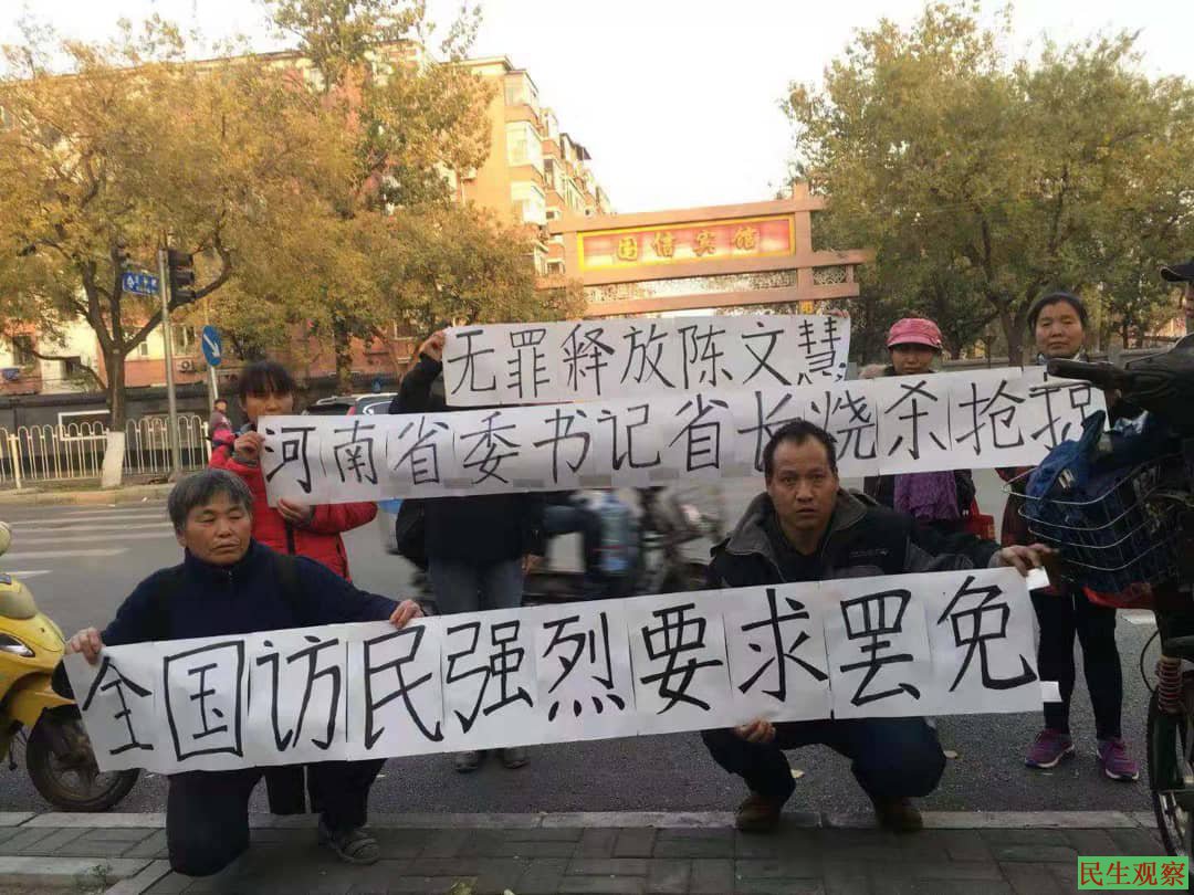 在京访民举牌要求释放河南陈文慧 |