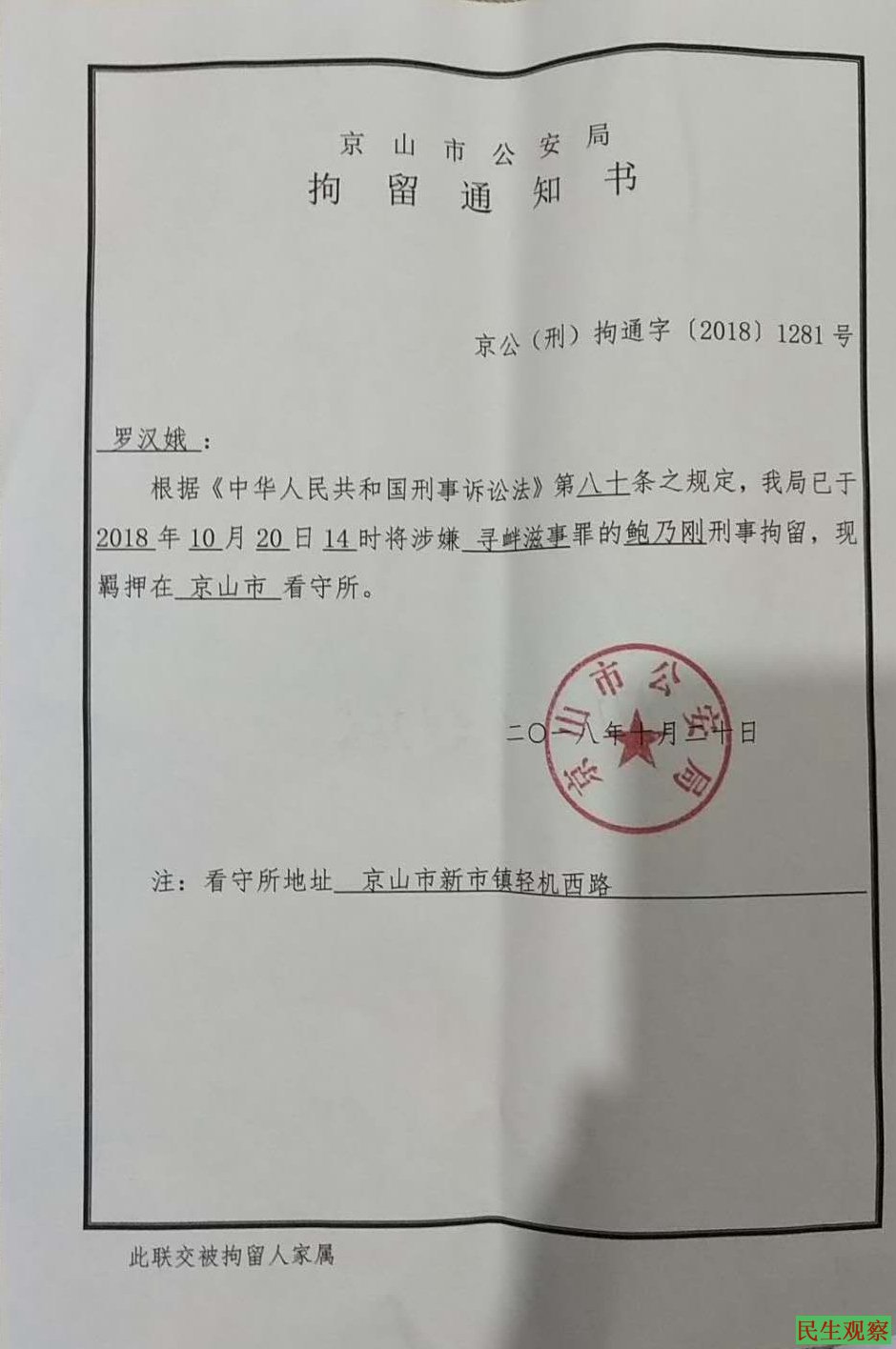 2017年10月22日,鲍乃刚收到荆门市中级人民法院传票,得知其因围观武汉王芳案遭行政拘留诉京山县公安局二审将于2017年10月31日上午九点在荆门市中级人民法院第十审判庭开庭。
