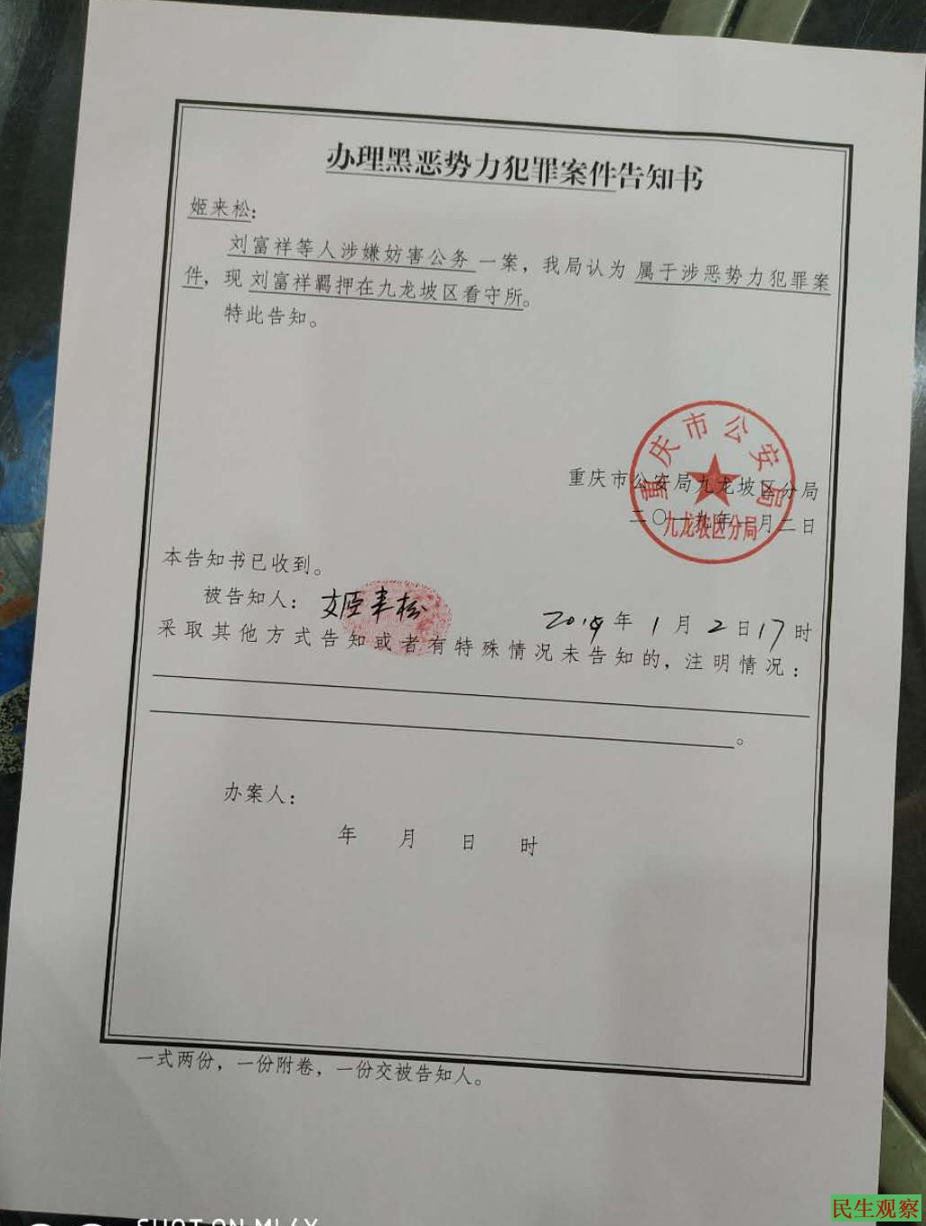2019年1月2日,姬来松律师受刘富祥家人委托,到九龙坡区公安分局了解案情,被告知:“刘富祥等人涉嫌妨害公务一案,我局认为属于涉恶势力犯罪案件。”