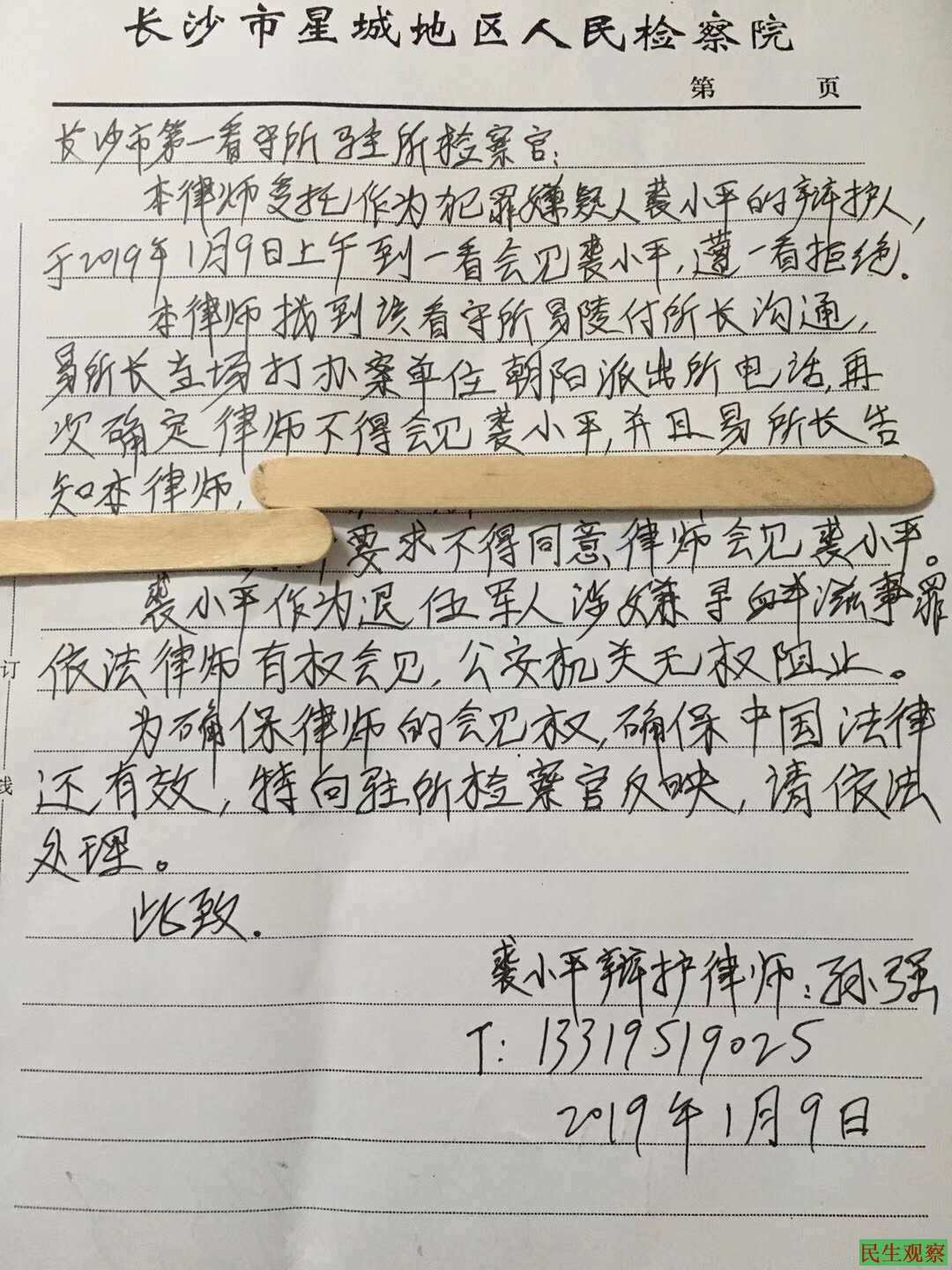 随后,孙强律师向长沙一看的驻所检察官提出控告,指出裘小平只是被控“寻衅滋事罪”,依照相关法律规定,律师有权会见,公安办案单位无权阻止。为了确保法律还有效,特向驻所检察官反映情况,希望能够依法处理。