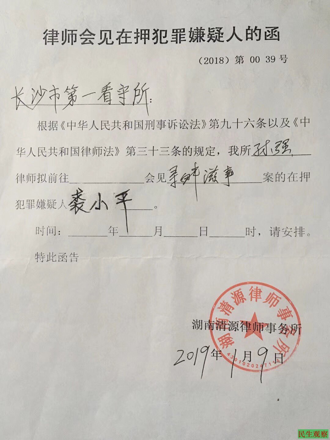 日前,湖南清源律师事务所孙强律师受裘小平家属委托担任辩护律师。周三1月9日上午,孙强律师去到位于长沙星沙的长沙一看要求会见裘小平,值班工作人员在查询电脑后告知,根据电脑标注,裘小平不得会见,理由不详。孙强律师找到该所易姓副所长查询,对方当即与裘小平案的办案单位朝阳派出所取得联系。经再次确认得知裘小平不准律师会见,办案单位强调不予会见的理由不便公开。易性副所长同时再三强调律师不能公开拒见理由,否则恐有麻烦。