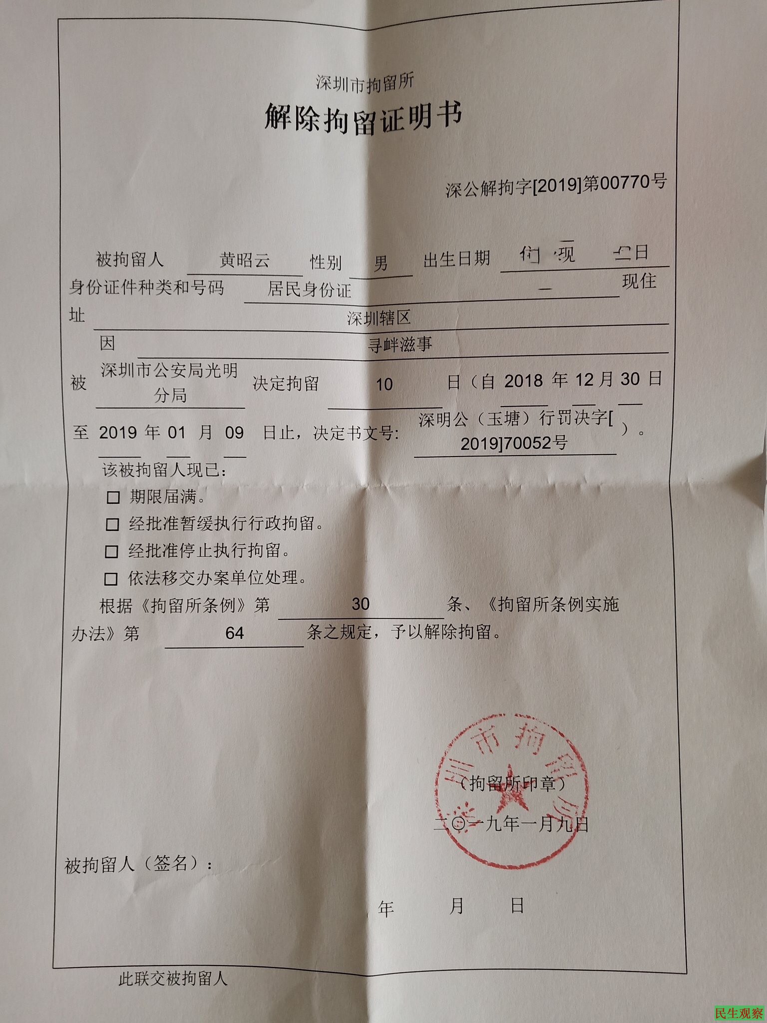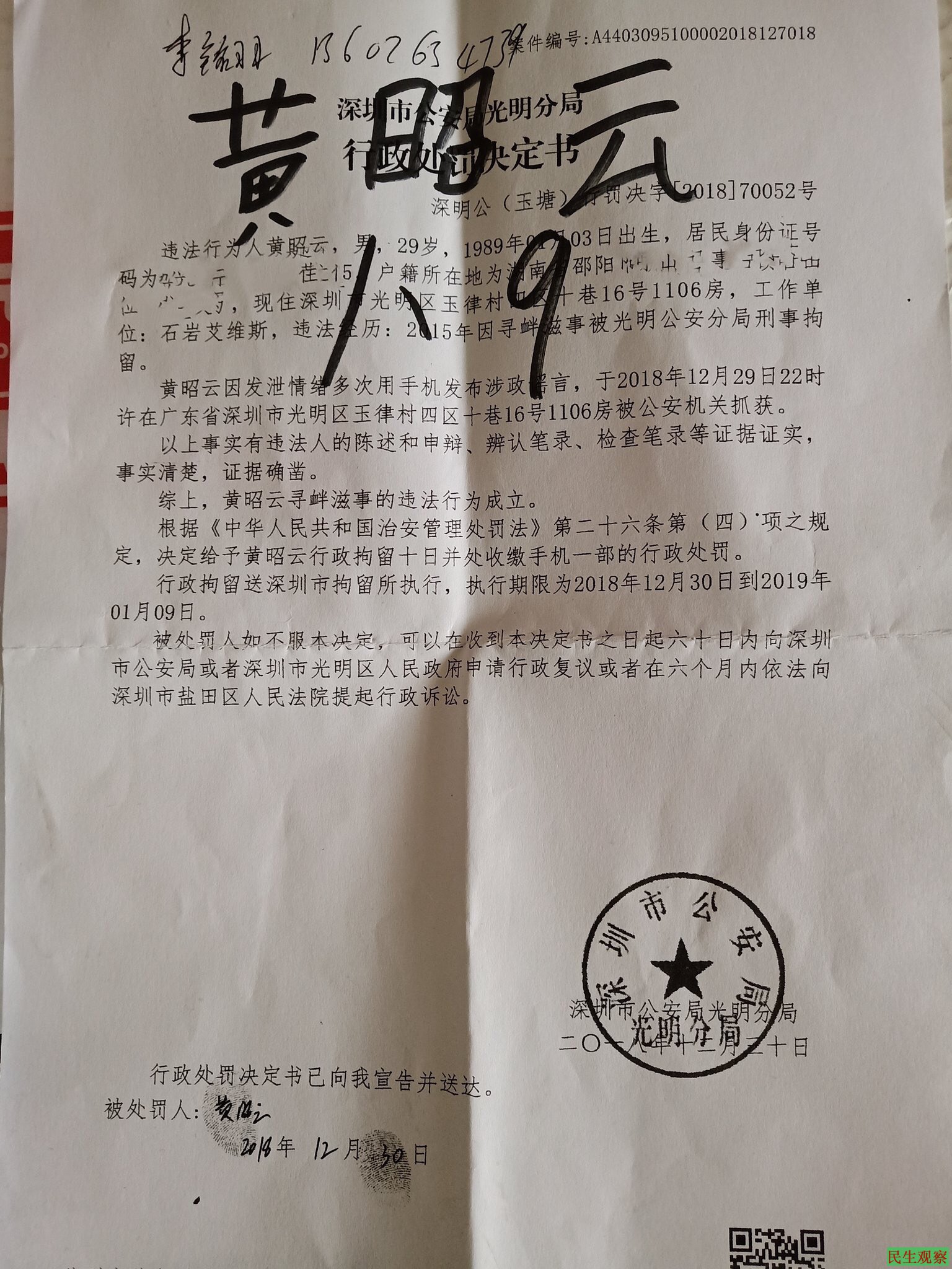 因手机被无故扣押,给工作生活带来诸多不便,黄昭云分别于12月27、28、29日向辖区派出所索要被扣手机,均无果。12月29日晚九点多,黄昭云再次遭到光明新区警方的强制传唤,罪名是“寻衅滋事”,在传唤十多小时后,警方于12月30日上午对其作出行政拘留十天的处罚决定,黄昭云被直接送往深圳市拘留所,同时收缴(没收)其一部个人手机。
