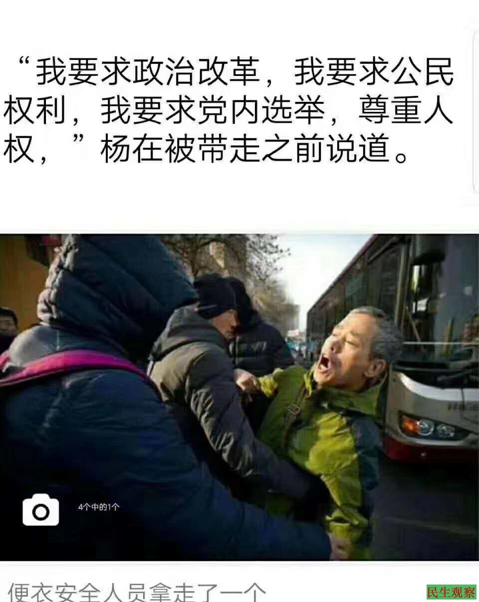 据悉,2018年12月26日上午八点左右,前去天津二中院旁听“709”王全璋被控“颠覆国家政权罪”案开庭的杨春林在现场被便衣人员抓捕。当时杨春林在现场高喊“王全璋是好人”、”支持王全璋”等言论,杨春林还痛斥共产党非人的暴政极权统治,当时现场有大批外媒记者在场拍摄。整个过程仅有三分钟不到,杨春林很快就被戴着大口罩的便衣人员强行绑架带走,不知所踪。
