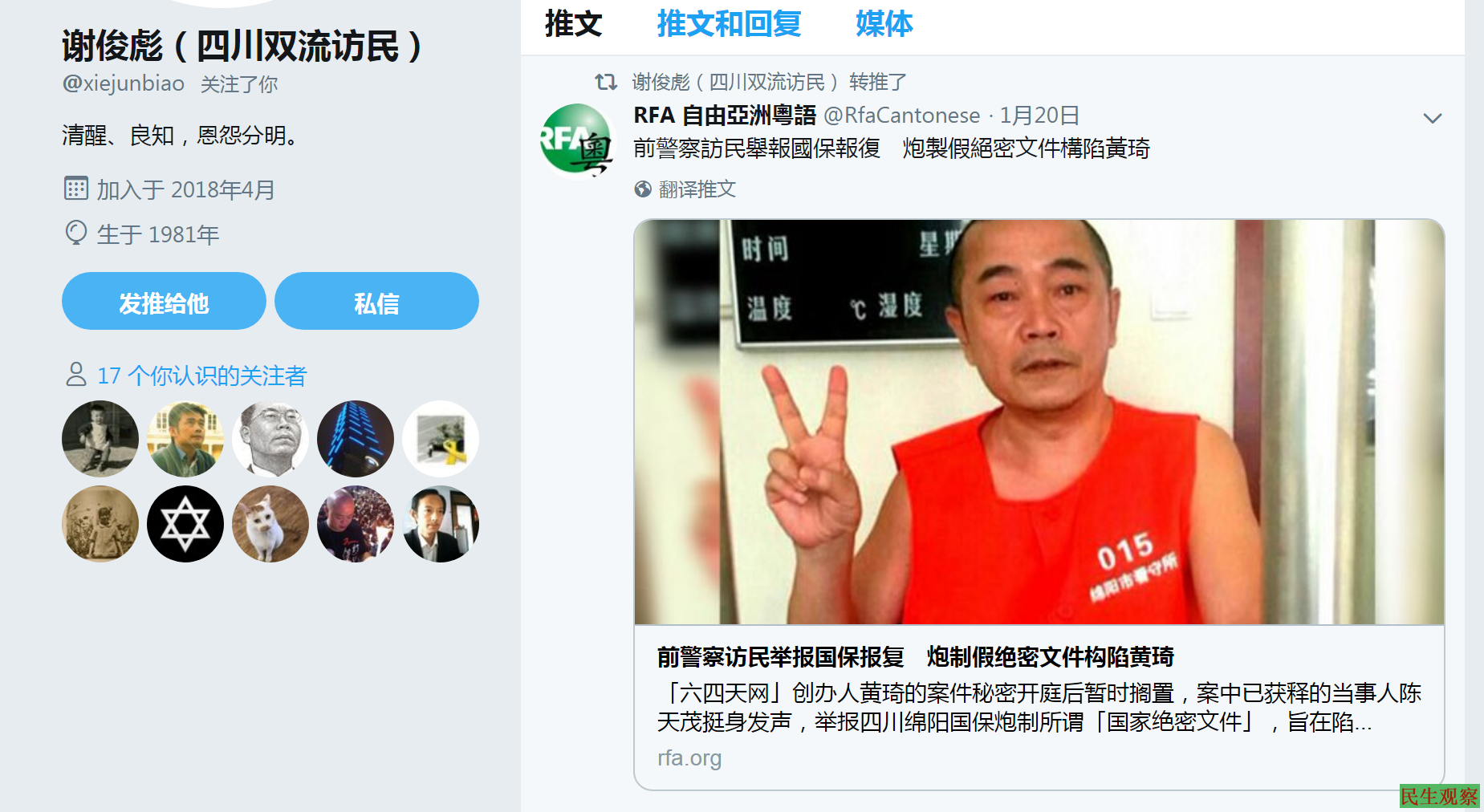 谢俊彪最后一条推文是转发题为“前警察访民举报国保报复 炮制假绝密文件构陷黄琦”的新闻。