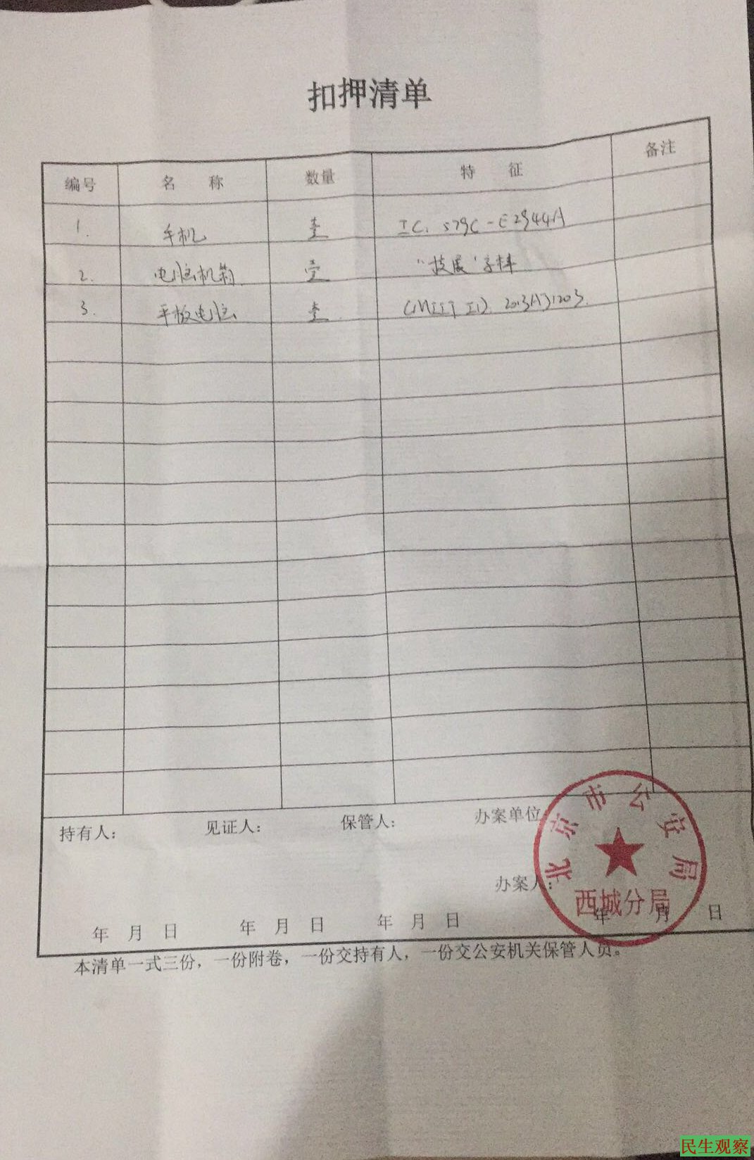 【民生观察2019年1月22日消息】本网获悉,2019年1月21日下午4点26分,四川成都市双流区公兴派出所警察4人和北京市西城派出所警察2人,来到成都双流区维权人士谢俊彪家中,以谢俊彪在网上转发文章为理由,于当天下午5点10分把谢俊彪从家中带走,至今未归。临走时警方只给家属留下了一份扣押清单。清单显示,谢俊彪的手机和电脑均被北京警方扣押。