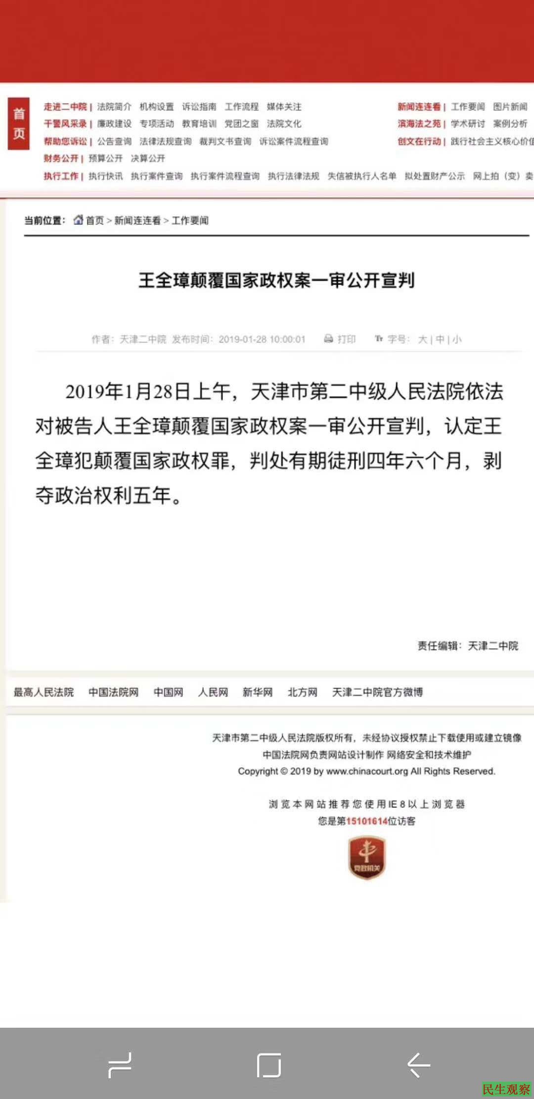 【民生观察2019年1月28日消息】三年半前曾一度震惊全球牵涉甚广的政治(人权)迫害案件“709”最后一名涉案律师王全璋被控“颠覆国家政权罪”案于1月28日一审宣判,当局“依法”作出判决,当事人王全璋律师被判有期徒刑四年半,剥夺政治权利五年。