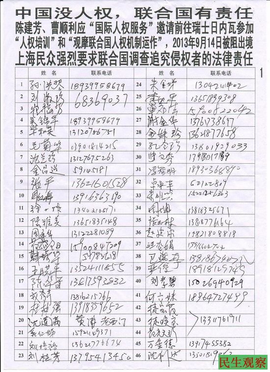 上海235名维权民众强烈要求中共当局立即还曹顺利人身自由,放行曹顺利和陈建芳等人权捍卫者去联合国参加旁听10月22日对中国的普遍定期审议。