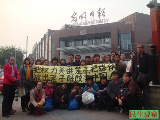 民生观察工作室2013-10-28消息:今天上午,全国各地数十名在北京的访民今天分别来到光明日报社、法制日报社等官方媒体,声援最近被抓的记者陈永洲等人。访民们在他们打出的大幅标语中写道:“把权力关进笼子里 把媒体放出笼子能改变中国”“民心记者是媒体的生命”。