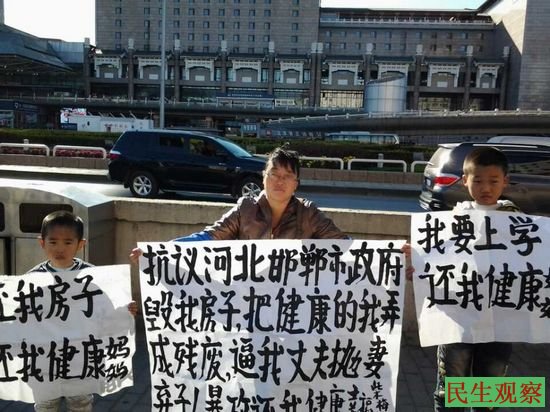 民生观察工作室2013-11-4消息:昨天,河北省邯郸访民柴梅香带着自己两个年幼的孩子,在北京西站对面的大街上举牌抗议。柴梅香手举“抗议河北邯郸市政府毁我房子,把健康的我弄成残废,逼我丈夫抛妻弃子!暴政还我健康——柴梅香宣”两个孩子一左一右的分别举着“还我房子,还我健康”“我要上学,还我健康”的标语,站在川流不息的大街上向市民宣讲自己被侵害的遭遇,控诉地方政府的违法强拆、迫害上访者的罪恶行径。
