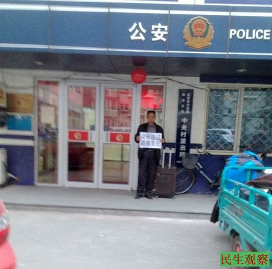民生观察工作室2013-11-12消息:今天是武汉巿访民童斌此次到北京上访的第十二天,今天中午他准备到三中全会的会场附近以所谓的违法方式(举牌控诉),来揭露地方政府的违法犯罪行为,却被武汉市洪山区的接访人员拦住制止。据童斌述说,此次武汉维稳人员的截访行为比以前的暴力截访方式要好一了些,他们这次没有向以前那样暴力殴打他,也没象以前他历次所经历的那样,以违法的方式派汽车来强行押送他回原籍关押,而是以相对文明的方式与童斌协商,征求他的意见是否愿意返回原籍。童斌拒绝了返回原籍的建议,下午他来到海淀区中关村派出所,要求所长尽职尽责,给曾经在该辖区被殴打的受害人童斌开具报案受理回执单。但是,该所的桂磊所长就是不为所动,以不作为的方式对童斌的合法要求不予理睬。之后,童斌就多次拨打电话到该派出所的上级监督部门,北京市公安局的警务督察处举报,但是,警务督察也没人来出力此事。童斌质问这里的警察:人民养着你们这些警察,不是让为人民服务的吗?难道你们只是保护犯罪分子的吗?受害人童斌请求上级公安机关清岀这些不作为却保护罪犯的警察,严惩这些制造成公民严重伤残的刑事犯罪嫌疑人。