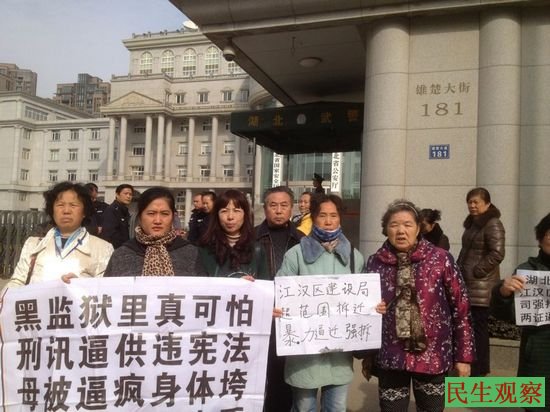 民生观察工作室2013-11-27消息:闻听公安部要派人来武汉督办案件,武汉三镇的数十位上访人士,继昨天集体来到武汉市公安局维权以来,今天上午他们再次来到了湖北省公安厅的门前举牌维权(第五天在武汉的公安部门聚集),要求面见公安部的督察组人员,亲自举报武汉公安机关的不立案、不破案、不作为等违法行为;亲自向公安部的督察组人员陈诉自己所经历的非法关押、黑监狱以及部分警察充当刑事犯罪团伙的保护伞等问题。