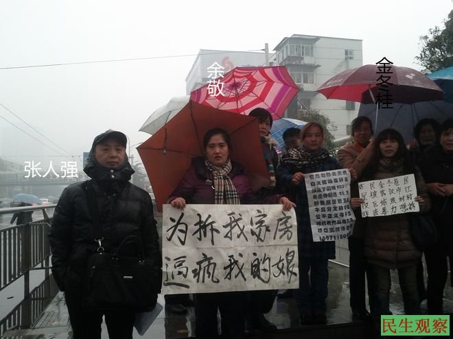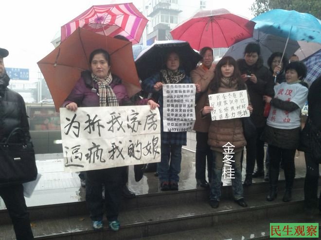民生观察工作室2014-1-7消息:今天是武汉“二会”的第三天,武汉市三镇访民金冬桂、程翠红、胡家群、张人强、邹立衡、肖明、胡新建、余敬、韩青兰、胡爽莲、汤素芳、郑明荣,嫣文、陈文英、杨桂英、吴桂娥、夏幼华、邱庆华、吴长维、吴长卫、李玉琴等人冒着大雨,在“二会”会场前,期待与武汉市人大的领导或人大代表对话,寻找解决社会和谐的长效机制,但最终无果而终。