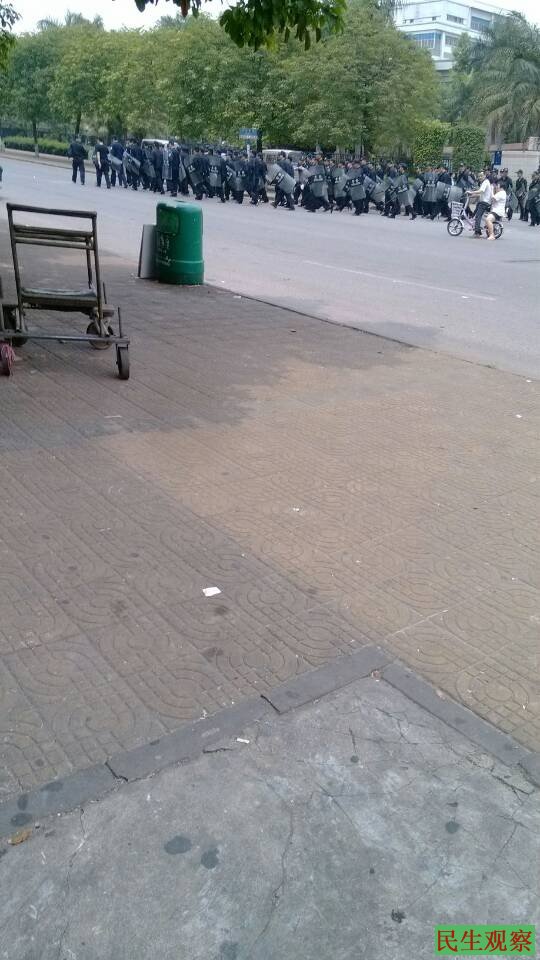 民生观察网2014年4月18日:东莞市高埗镇裕元六厂的工人持续罢工,但今天并未上街和聚集,厂区四周有大批特警、治安员和狼犬。中午十一点多工人陆续走出工厂,四周蹲守的政府警卫人员全体起立,手持盾牌、警棍、头盔。