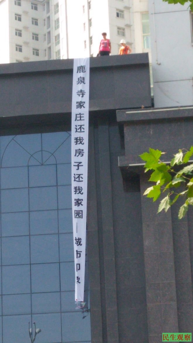 民生观察工作室2014-8-11消息:今天上午,河北省石家庄市鹿泉市寺家庄城市印象多名业主来到鹿泉县政府对面,他们爬上了政府对面一栋楼房,打出标语高呼“还我房子”“还我家园”。