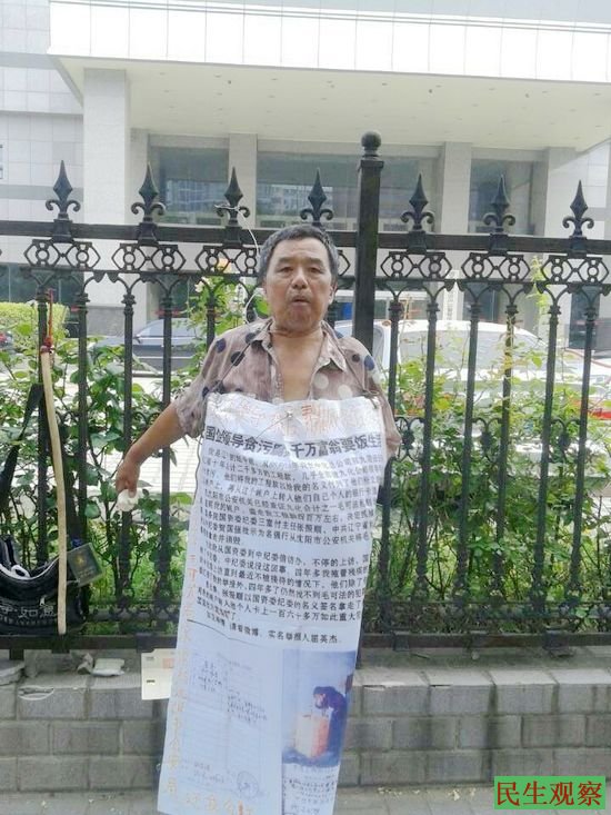 民生观察工作室2014-8-22消息:今天上午,黑龙江省盘锦市访民赵令恩来到了北京国资委门前挂牌控诉黑龙江盘锦国企贪腐、违规违法幕后交易;地方政府对他上访维权进行非法拦截。