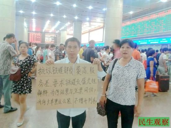 张荣平标语的抗议内容为:抗议铁道部收费高、服务差,要求铁道部长盛光祖解释:为何站票与坐票同价?为何火车票这么紧不增开列车?