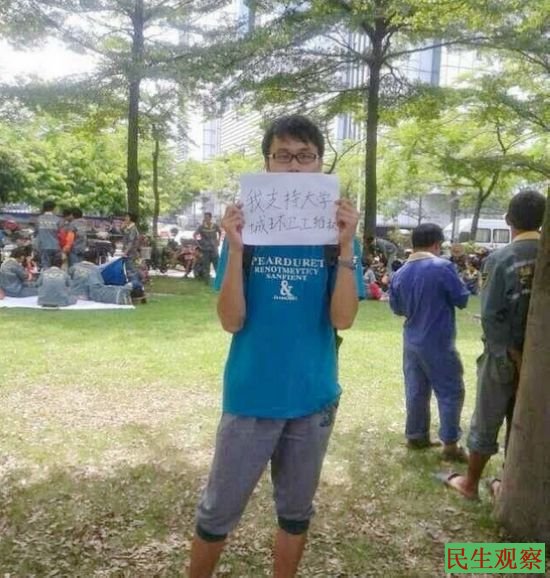 今天广州维权人士张圣雨来到了维权现场,据其称:今天罢工的工人们依然在大学城外静坐抗议,同时还来了很多大学生也加入其中,他们与工人一起表达了抗议且合影留念。我本人也给工人们发放了我的维权名片,要他们上网或者让亲人们帮助他们上网传播此次维权消息,让更多的人都来关注他们的劳工权益,这样,当局才会重视他们的合理诉求,才不敢派警察来随便抓捕或迫害他们。