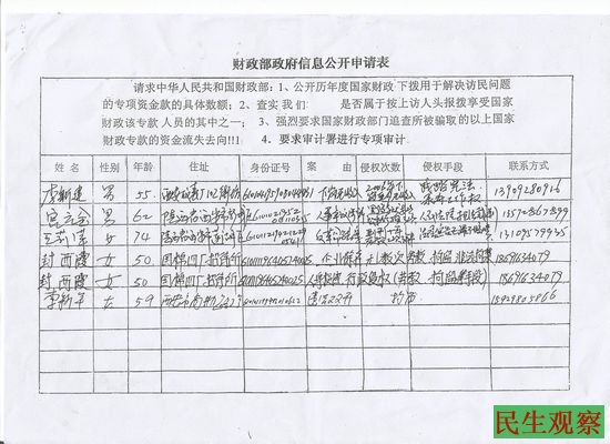 王莉苹从今年5月份就开始向中央财政部申请信息公开,要求公开国家财政下拨用于解决访民问题的专项资金的具体数额及财政专款资金的去向,直至今日她都没拿到任何答复。