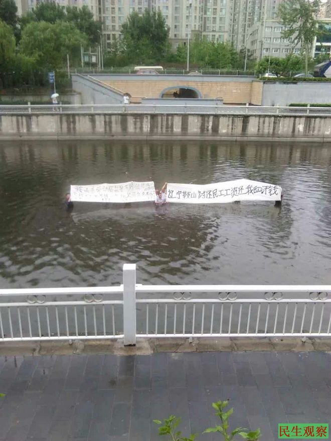 九名辽宁鞍山农民工北京跳入河中拉横幅讨薪