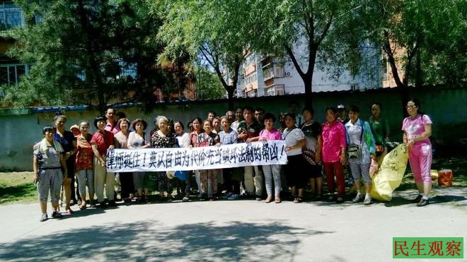 民生观察工作室2015/8/15消息:自7月份大批维权律师被抓后,激起了许多访民的愤怒,今天数十位在京访民打出了“律师挺住,莫以自由为代价充当破坏法制的帮凶”“立即释放维权律师”的条幅。