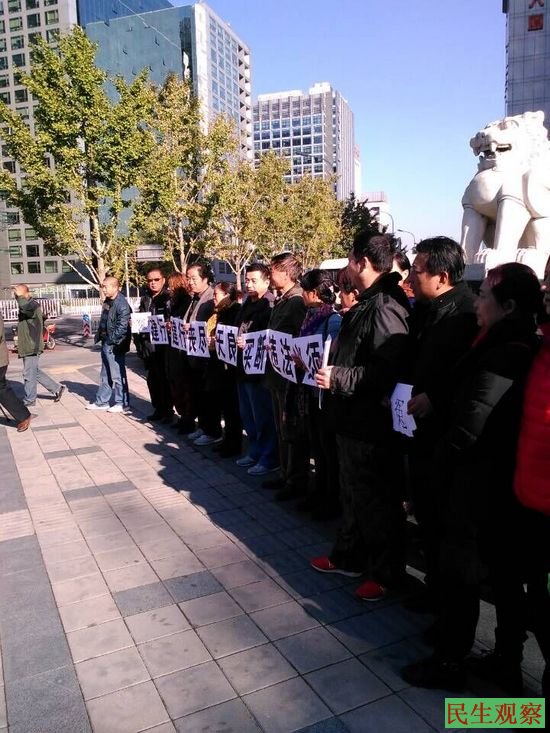民生观察工作室2015-10-31消息:据湖北维权人士伍立娟告诉本工作室,今天一位建行断友(被买断工龄员工)给她打来电话说:今天有数十名来自全国各地的银行断友,在北京建行总部举牌伸冤。在此之前,他们还在五中全会期间,来到北京参加了建总行的股东大会伸冤活动。