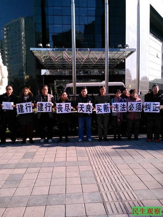 最后,大家决定就在北京建行总部举牌维权。于是,在场的三十多人就开始在门口举牌伸冤,他们拿出写着“建行建行丧尽天良,买断违法,违法必纠”等标语进行抗议,同时还有断友身穿冤衣,对着苍天高呼“苍天啊!我们冤。天子脚下却没有(包青天)!”