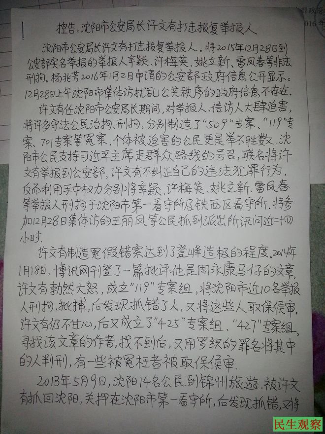 三十三位沈阳公民最高检控告沈阳市公安局长许文有