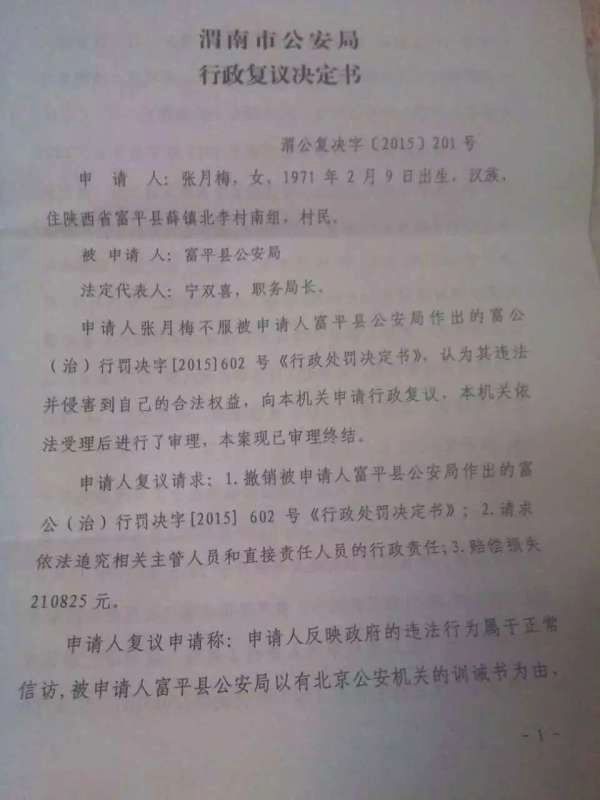 陕西省富平县访民拘留案行政复议竟胜诉