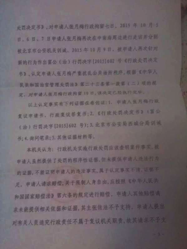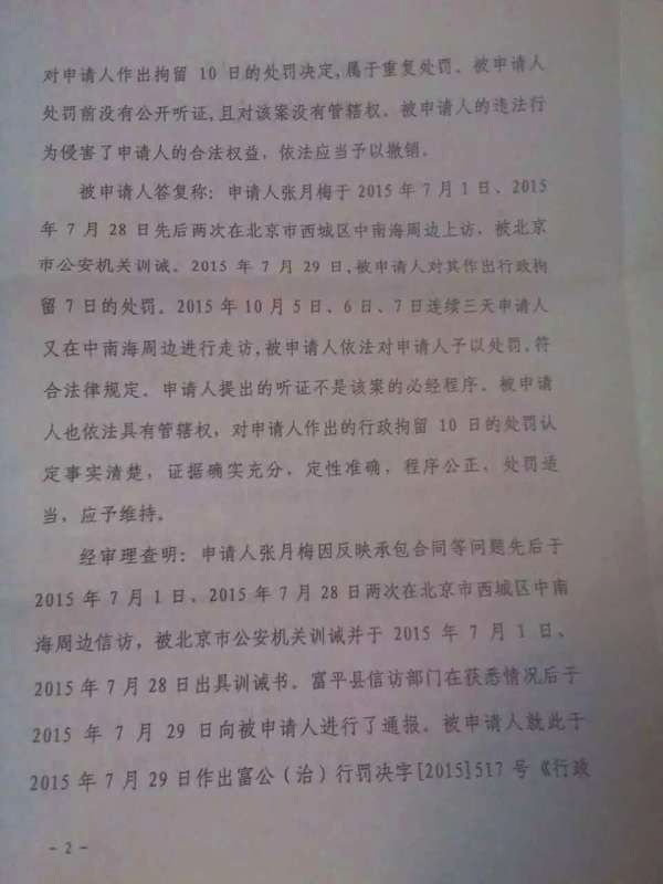 2015年10月,富平县公安局以张月梅到北京中南海周边走访为由,认定其扰乱了公共场所秩序,并受到北京警方训戒为由行政拘留十日。