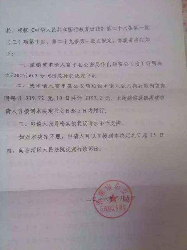 渭南市公安局2016年3月作出的这份行政复议决定书,虽然撤销了富平县公安局对张月梅的处罚决定,要求富平县公安局赔偿张月梅十日拘留期间的经济损失二千多元,但却拒绝了张月梅的追究富平县公安局相关责任人的责任等要求。