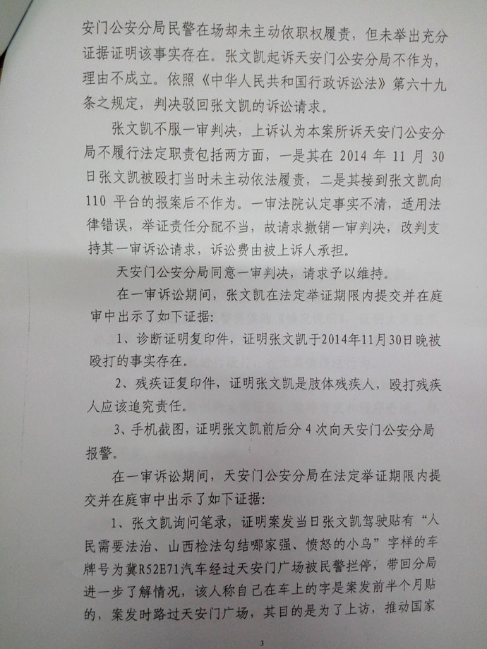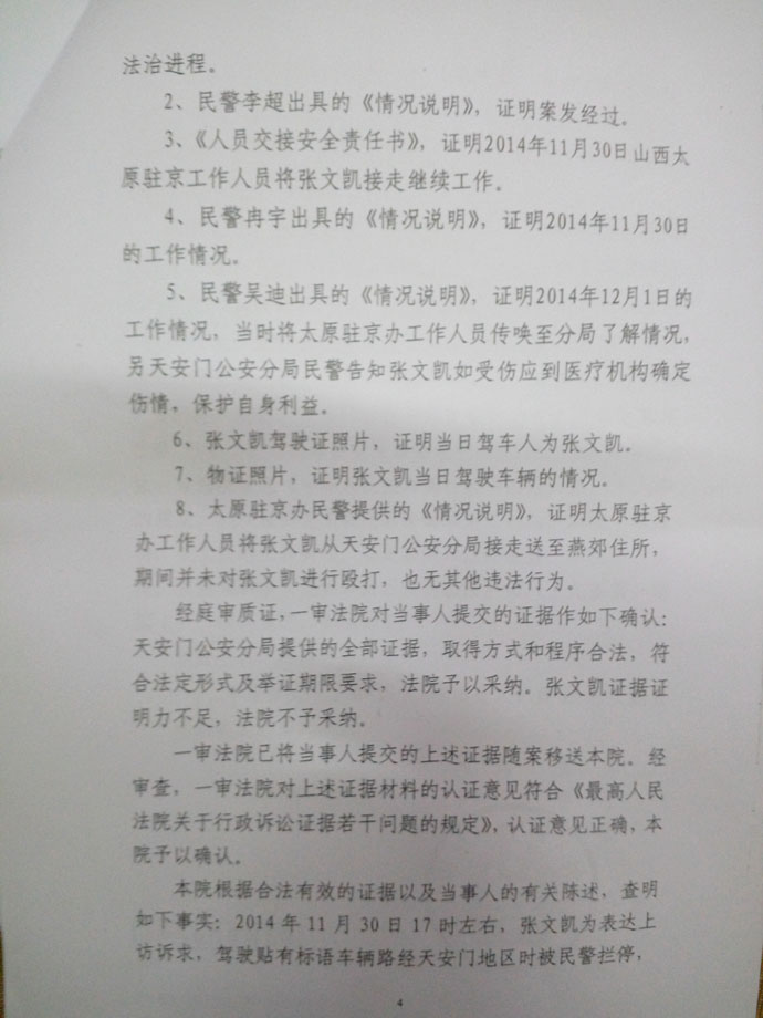 北京市第二中级人民法院(2016)京02行终231号行政判决书中载明,天安门分局在一审中辩称,2014年11月30日17时左右,张文凯驾驶贴有标语的汽车被拦截交给太原市驻京工作组接回。2014年12月1日,张文凯报警称在接回过程中在天安门分局门前被打,经了解情况,双方已私下达成一致,不需要公安机关在介入。