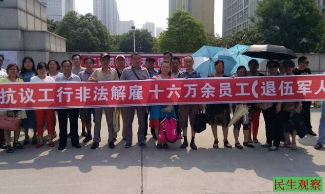 据现场人士介绍,这些员工来自河南省各县市,有七十多人,都是原工行员工。今天大家打着横幅表示抗议,横幅上写着工行非法解雇十几万职工与退伍军人等,还有穿着工行下岗老员工的T恤衫表达抗议的。