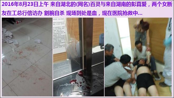 民生观察工作室2016/8/23消息:今天上午九点左右,二位正在北京上访的原工行下岗职工黄行芝与彭真爱,在工商银行总行信访接待室割腕自杀,现正在北京复兴医院抢救。