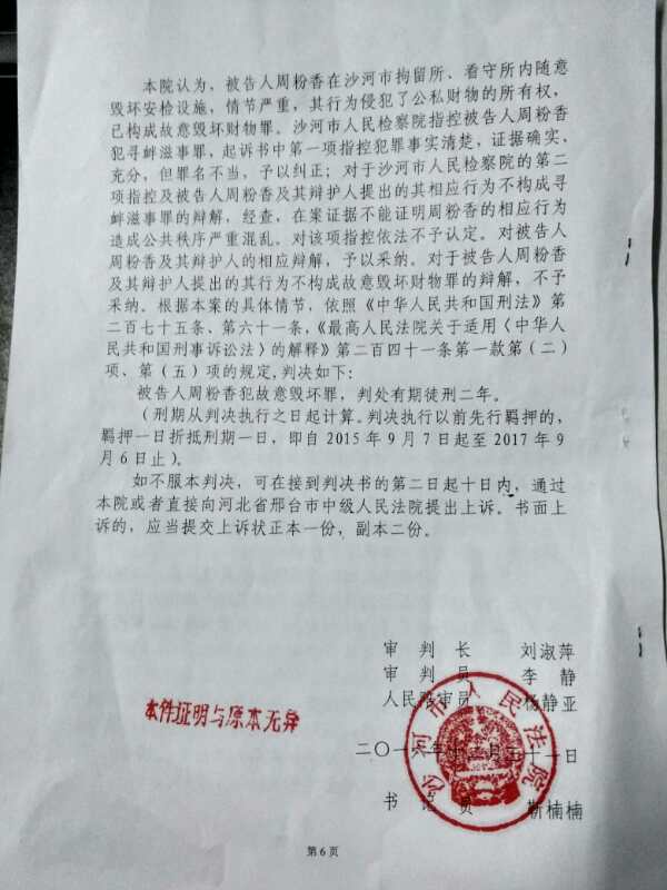 而迫使沙河市法院改判的原因是周粉香不服原判决,委托律师提起上诉,邢台市中级人民法院裁定撤销原判,发回重审。2016年12月31日沙河市法院作出判决,以“故意毁坏罪”判处周粉香有期徒刑两年,刑期自2015年9月7日起至2017年9月6日止。