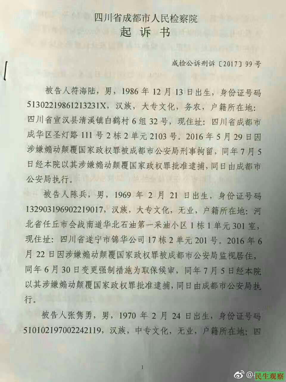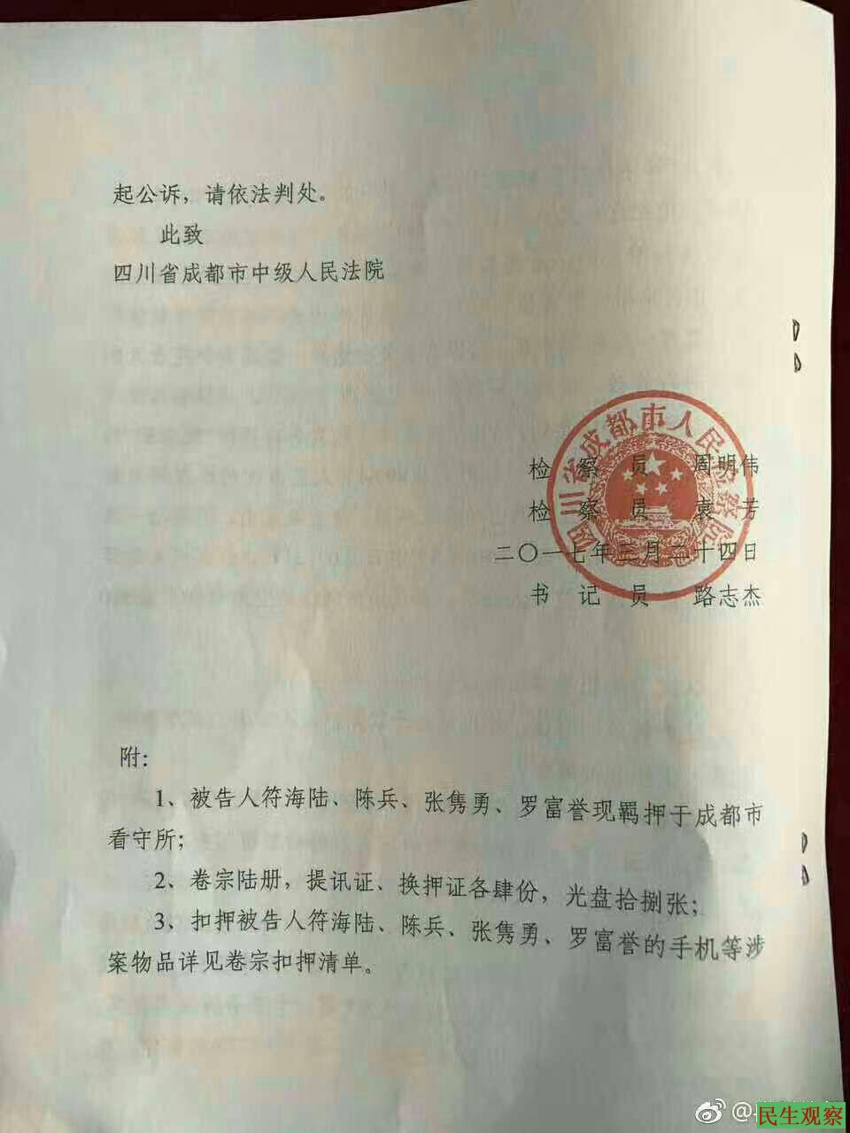【民生观察工作室2017年4月13日成都消息】今天上午,四川成都冉彤律师发出消息,称近日收到成都市检察院寄来的起诉书,“成都铭酒四君子” 被以“涉嫌煽动颠覆国家政权罪”提起公诉。